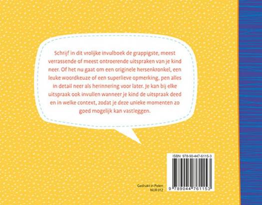 Schrijf in dit vrolijke invulboek de grappigste, meest verrassende of meest ontroerende uitspraken van je kind neer als herinnering voor later. Je kan bij elke uitspraak ook invullen wanneer je kind de uitspraak deed en in welke context, zodat je deze unieke momenten zo goed mogelijk kan vastleggen.