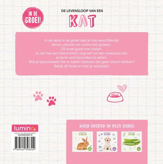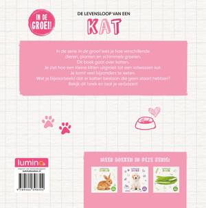 In de serie In de groei! lees je hoe verschillende dieren, planten en schimmels groeien. Dit boek gaat over katten. Je ziet hoe een kleine kitten uitgroeit tot een volwassen kat. Je komt veel bijzonders te weten. Wist je bijvoorbeeld dat er katten bestaan die geen staart hebben? Bekijk dit boek en laat je verbazen!