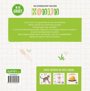In de serie In de groei! lees je hoe verschillende dieren, planten en schimmels groeien. Dit boek gaat over konijnen. Je ziet hoe kale babykonijntjes uitgroeien tot pluizige volwassen konijnen. Je komt veel bijzonders te weten. Wist je bijvoorbeeld dat er een konijn is dat kan basketballen? Bekijk dit boek en laat je verbazen!
