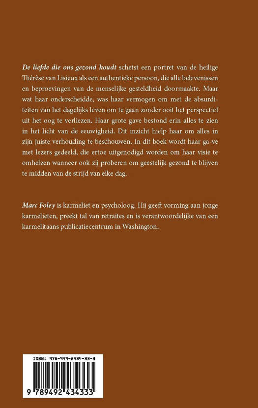 De liefde die ons gezond houdt schetst een portret van de heilige Thérèse van Lisieux als een authentieke per-soon, die alle belevenissen en beproevingen van de menselijke gesteldheid doormaakte. Maar wat haar onderscheidde, was haar vermogen om met de absurditeiten van het dagelijks leven om te gaan zonder ooit het perspectief uit het oog te verliezen. Haar grote ga-ve bestond erin alles te zien in het licht van de eeu-wigheid. Dit inzicht hielp haar om alles in zijn juiste verhouding te beschouwen. In dit boek wordt haar ga-ve met lezers gedeeld, die ertoe uitgenodigd worden om haar visie te omhelzen wanneer ook zij proberen om geestelijk gezond te blijven te midden van de strijd van elke dag.