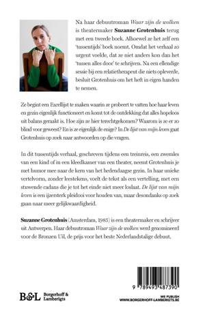 Na haar debuutroman Waar zijn de wolken is theatermaker Suzanne Grotenhuis terug met een tweede boek. Alhoewel ze het zelf een 'tussentijds' boek noemt. Omdat het verhaal zo urgent voelde, dat ze niet anders kon dan het 'tussen alles door' te schrijven. Na een ellendige sessie bij een relatietherapeut die niets opleverde, besluit Grotenhuis om het heft in eigen handen te nemen. Ze begint een Excel-lijst te maken waarin ze probeert te vatten hoe haar leven en gezin eigenlijk functioneert, en komt tot de ontdekking dat alles hopeloos uit balans geraakt is. Hoe zijn ze hier terechtgekomen? Waarom is ze er zo blind voor geweest? En is ze eigenlijk de enige? In De lijst van mijn leven gaat Grotenhuis op zoek naar antwoorden op die vragen.