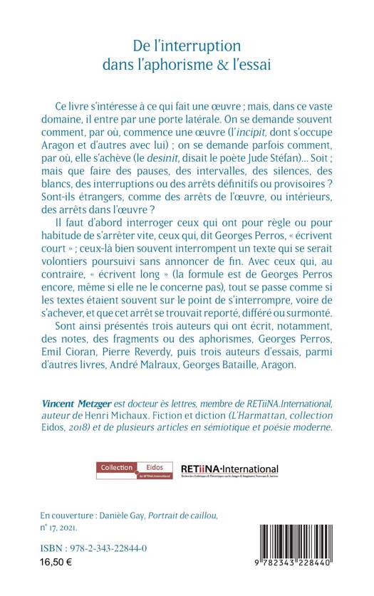 Cet ouvrage s'intéresse à ce qui fait une oeuvre Mais dans ce vaste domaine, il entre par une porte latérale. On se demande souvent comment, par où commence une oeuvre, ou bien comment et par où elle s'achève. Mais que faire des pauses, intervalles, silences, blancs, interruptions ou des arrêts définitifs ou provisoires ? Sont-ils étrangers, comme des arrêts de l'oeuvre, ou intérieurs, des arrêts dans l'oeuvre ? Il faut d'abord interroger ceux qui ont pour règle ou pour habitude de s'arrêter vite, ceux qui, dit Georges Perros, "écrivent court"; ceux-là bien souvent interrompent un texte qui se serait volontiers poursuivi sans annoncer de fin. Avec ceux qui, au contraire, "écrivent long", tout se passe comme si les textes étaient souvent sur le point de s'interrompre, et que l'arrêt se trouvait reporté. Sont ainsi présentés des auteurs qui ont écrit, notamment, des notes, des fragments ou des aphorismes, Perros, Cioran, Reverdy, puis trois auteurs d'essais, Malraux, Bataille, Aragon.