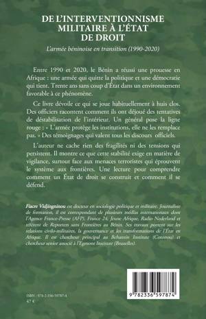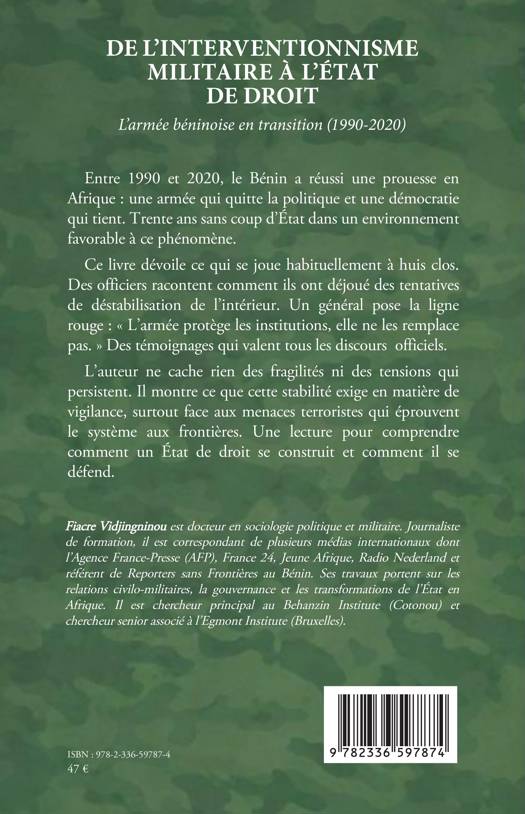 Entre 1990 et 2020, le Bénin a réussi une prouesse en Afrique: une armée qui quitte la politique et une démocratie qui tient. Trente ans sans coup d'État dans un environnement favorable à ce phénomène. Ce livre dévoile ce qui se joue habituellement à huis clos. Des officiers racontent comment ils ont déjoué des tentatives de déstabilisation de l'intérieur. Un général pose la ligne rouge: L'armée protège les institutions, elle ne les remplace pas. Des témoignages qui valent tous les discours officiels. L'auteur ne cache rien des fragilités ni des tensions qui persistent. Il montre ce que cette stabilité exige en matière de vigilance, surtout face aux menaces terroristes qui éprouvent le système aux frontières. Une lecture pour comprendre comment un État de droit se construit et comment il se défend.