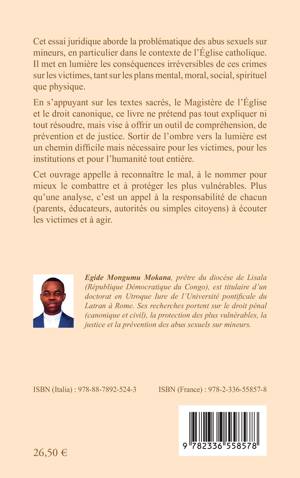 Cet essai juridique aborde la problématique des abus sexuels sur mineurs, en particulier dans le contexte de l'Église catholique. Il met en lumière les conséquences irréversibles de ces crimes sur les victimes, tant sur les plans mental, moral, social, spirituel que physique. En s'appuyant sur les textes sacrés, le Magistère de l'Église et le droit canonique, ce livre ne prétend pas tout expliquer ni tout résoudre, mais vise à offrir un outil de compréhension, de prévention et de justice. Sortir de l'ombre vers la lumière est un chemin difficile mais nécessaire pour les victimes, pour les institutions et pour l'humanité tout entière. Cet ouvrage appelle à reconnaître le mal, à le nommer pour mieux le combattre et à protéger les plus vulnérables. Plus qu'une analyse, c'est un appel à la responsabilité de chacun (parents, éducateurs, autorités ou simples citoyens) à écouter les victimes et à agir.