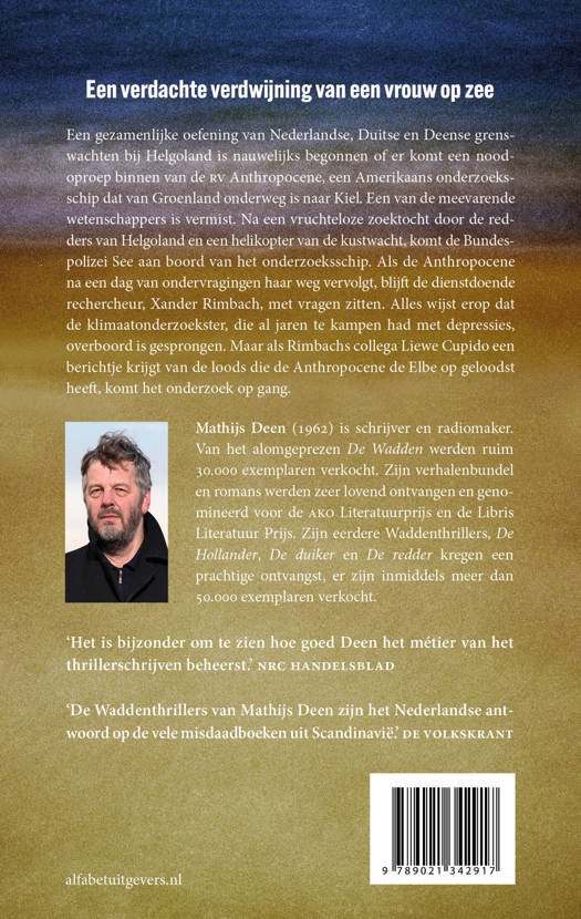 Een gezamenlijke oefening van Nederlandse, Duitse en Deense grenswachten bij Helgoland is nauwelijks begonnen of er komt een noodoproep binnen van de RV Anthropocene, een Amerikaans onderzoeksschip dat van Groenland onderweg is naar Kiel. Een van de meevarende wetenschappers is vermist. Na een vruchteloze zoektocht door de redders van Helgoland en een helikopter van de kustwacht, komt de Bundespolizei See aan boord van het onderzoeksschip. Als de Anthropocene na een dag van ondervragingen haar weg vervolgt, blijft de dienstdoende rechercheur, Xander Rimbach, met vragen zitten. Alles wijst erop dat de klimaatonderzoekster, die al jaren te kampen had met depressies, overboord is gesprongen. Maar als Rimbachs collega Liewe Cupido een berichtje krijgt van de loods die de Anthropocene de Elbe op geloodst heeft, komt het onderzoek op gang.