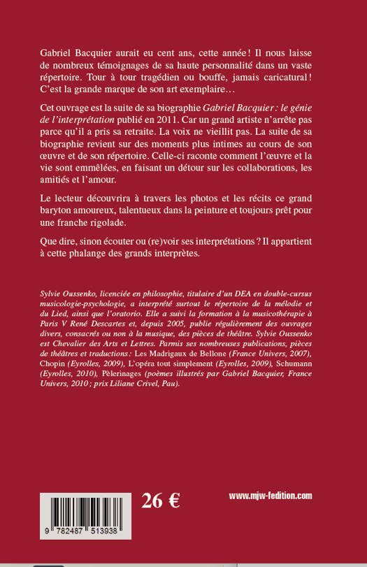 Gabriel Bacquier aurait eu cent ans, cette année ! Il nous laisse de nombreux témoignages de sa haute personnalité dans un vaste répertoire. Tour à tour tragédien ou bouffe, jamais caricatural ! C'est la grande marque de son art exemplaire…Cet ouvrage est la suite de sa biographie Gabriel Bacquier : le génie de l’interprétation publié en 2011. Car un grand artiste n’arrête pas parce qu’il a pris sa retraite. La voix ne vieillit pas. La suite de sa biographie revient sur des moments plus intimes au cours de son œuvre et de son répertoire. Celle-ci raconte comment l’œuvre et la vie sont emmêlées, en faisant un détour sur les collaborations, les amitiés et l’amour. Le lecteur découvrira à travers les photos et les récits ce grand baryton amoureux, talentueux dans la peinture et toujours prêt pour une franche rigolade.Que dire, sinon écouter ou (re)voir ses interprétations ? Il appartient à cette phalange des grands interprètes.