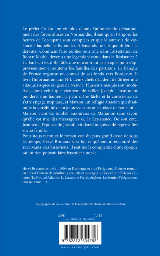 Le préfet Callard ne vit plus depuis l'annonce du débarquement des forces alliées en Normandie. Il sait qu'en Périgord les heures de l'occupant sont comptées et que le surcroît de violence à laquelle se livrent les Allemands ne fait que différer la déroute. Comment faire oublier son rôle dans l'arrestation de Robert Mathé, devenu une légende vivante dans la Résistance ? Callard sait les difficultés que rencontrent les maquis pour s'approvisionner et soutenir les familles des partisans. La Banque de France organise un convoi de ses fonds vers Bordeaux. Il livre l'information aux FFI. Leurs chefs décident de diriger une attaque risquée en gare de Neuvic. Plusieurs maquis sont mobilisés, dont celui que viennent de rallier Joseph, l'instituteur pondéré, que hantent la peur d'être lâche et la conscience de s'être engagé trop tard, et Marsou, un réfugié alsacien qui dissimule la sensibilité de sa jeunesse sous une audace de bon aloi... Marsou vient de tomber amoureux de Marianne sans savoir qu'elle est une des messagères de la Résistance. De son côté, Jeannette, l'épouse de Joseph, vit dans l'angoisse de représailles sur sa famille.