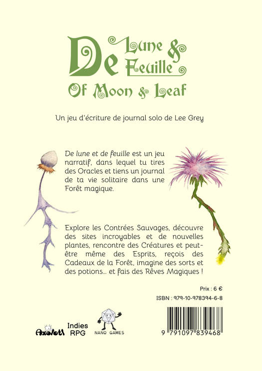 De lune et de feuille est un jeu narratif, dans lequel tu tires des Oracles et tiens un journal de ta vie solitaire dans une Forêt magique. Explore les Contrées Sauvages, découvre des sites incroyables et de nouvelles plantes, rencontre des Créatures et peut-être même des Esprits, reçois des Cadeaux de la Forêt, imagine des sorts et des potions… et fais des Rêves Magiques !