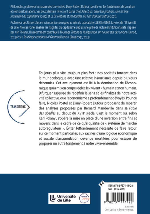 Toujours plus vite, toujours plus fort : nos sociétés foncent dans le mur écologique avec une relative insouciance depuis plusieurs décennies. Cet aveuglement est lié à la domination de l’économique qui a mis en coupe réglée le « vivant » humain et non humain. Bifurquer suppose de redéfinir le sens et les finalités de notre activité collective, que l’économisme a profondément dévoyés. Pour ce faire, Nicolas Postel et Dany-Robert Dufour proposent de repartir des analyses proposées par Bernard Mandeville dans sa Fable des abeilles au début du XVIIIe siècle. C’est le moment où, selon Karl Polanyi, s’opère la mise en place d’une inversion entre fins et moyens dans le cadre de ce qu’il qualifie de « système de marché autorégulateur ». Éviter l’effondrement nécessite de faire retour sur ce moment particulier, aux racines d’une logique économique et sociale d’accumulation devenue mortifère, pour essayer de proposer un autre fondement à notre vivre-ensemble.