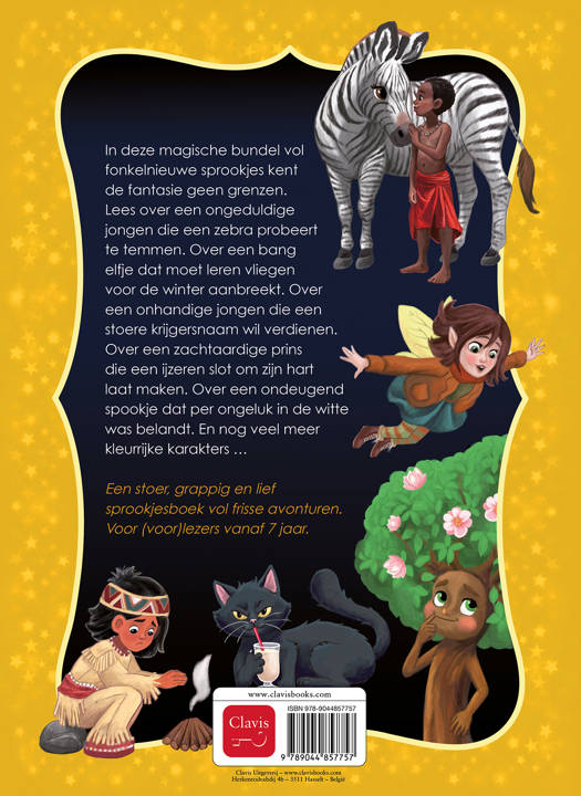 In deze magische bundel vol fonkelnieuwe sprookjes kent de fantasie geen grenzen. Lees over een ongeduldige jongen die een zebra probeert te temmen. Over een bang elfje dat moet leren vliegen voor de winter aanbreekt. Over een onhandige jongen die een stoere krijgersnaam wil verdienen. Over een zachtaardige prins die een ijzeren slot om zijn hart laat maken. Over een ondeugend spookje dat per ongeluk in de witte was belandt. En nog veel meer kleurrijke karakters …