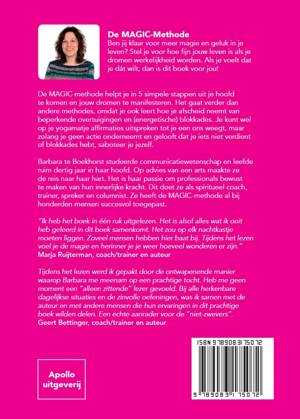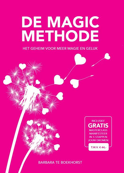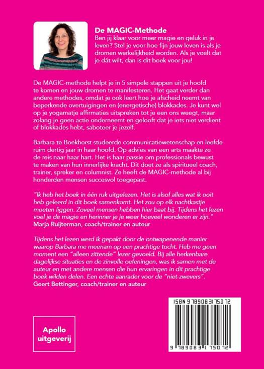 Ben jij klaar voor meer magie en geluk in je leven? Stel je voor hoe fijn jouw leven is als je dromen werkelijkheid worden. Als je voelt dat je dát wilt, dan is dit boek voor jou! De MAGIC-methode helpt je in 5 simpele stappen uit je hoofd te komen en jouw dromen te manifesteren. Het gaat verder dan andere methodes, omdat je ook leert hoe je afscheid neemt van beperkende overtuigingen en (energetische) blokkades. Je kunt wel op je yogamatje affirmaties uitspreken tot je een ons weegt, maar zolang je geen actie onderneemt en gelooft dat je iets niet verdient of blokkades hebt, saboteer je jezelf. Barbara te Boekhorst studeerde communicatiewetenschap en leefde ruim dertig jaar in haar hoofd. Op advies van een arts maakte ze de reis naar haar hart. Het is haar passie om professionals bewust te maken van hun innerlijke kracht. Dit doet ze als spiritueel coach, trainer, spreker en columnist. Ze heeft de MAGIC-methode al bij honderden mensen succesvol toegepast. “Ik heb het boek in één ruk uitgelezen. Het is alsof alles wat ik ooit heb geleerd in dit boek samenkomt. Het zou op elk nachtkastje moeten liggen. Zoveel mensen hebben hier baat bij. Tijdens het lezen voel je de magie en herinner je je weer hoeveel wonderen er zijn.” Marja Ruijterman, coach/trainer en auteur. “Tijdens het lezen werd ik gepakt door de ontwapenende manier waarop Barbara me meenam op een prachtige tocht. Heb me geen moment een “alleen zittende” lezer gevoeld. Bij alle herkenbare dagelijkse situaties en de zinvolle oefeningen, was ik samen met de auteur en met andere mensen die hun ervaringen in dit prachtige boek wilden delen. Een echte aanrader voor de “niet-zwevers”. Geert Bettinger, coach/trainer en auteur.