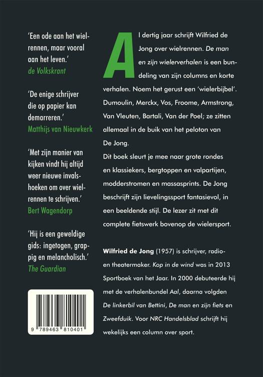 Het ideale boek voor tijdens de Tour de France!'Wilfried de Jong is de enige schrijver die op papier kan demarreren.' Matthijs van NieuwkerkAl dertig jaar schrijft Wilfried de Jong over wielrennen. De man en zijn wielerverhalen is een bundeling van zijn columns en korte verhalen. Noem het gerust een 'wielerbijbel'.Dumoulin, Merckx, Vos, Froome, Armstrong, Van Vleuten, Bartali, Van der Poel: ze zitten allemaal in de buik van het peloton van De Jong.Dit boek sleurt je mee naar grote rondes en klassiekers, bergtoppen en valpartijen, modderstromen en massasprints. De Jong beschrijft zijn lievelingssport fantasievol, in een beeldende stijl. De lezer zit met dit complete fietswerk bovenop de wielersport.'De wielerzomerhit (...). Prachtig geschreven.' NRC'Wilfried de Jong ademt wielrennen en kan daar ook ademloos over schrijven. Perfect boek.' **** De Limburger'Met zijn manier van kijken vindt hij altijd weer nieuwe invalshoeken om over wielrennen te schrijven.' Bert Wagendorp