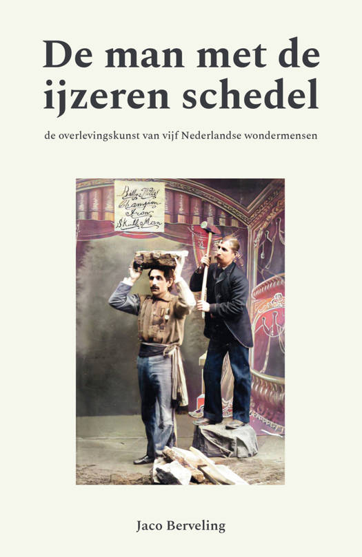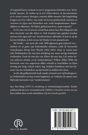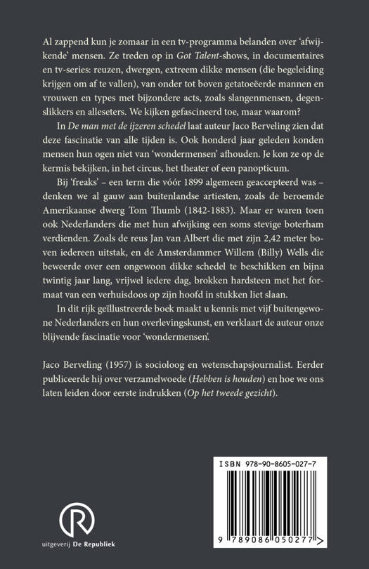 Al zappend kun je zomaar in een tv-programma belanden over ‘afwijkende’ mensen. Ze treden op in 'Got Talent'-shows, in documentaires en tv-series: reuzen, kleine mensen, extreem dikke mensen (die begeleiding krijgen om af te vallen), van onder tot boven getatoeëerde mannen en vrouwen en types met bijzondere acts, zoals slangenmensen en degenslikkers. We kijken gefascineerd toe, maar waarom? In 'De man met de ijzeren schedel' laat Jaco Berveling zien dat deze fascinatie van alle tijden is. Ook ruim honderd jaar geleden konden mensen hun ogen niet van ‘wondermensen’ afhouden. Bij ‘freaks’ – een term die vóór 1899 algemeen geaccepteerd was – denken we al gauw aan buitenlandse artiesten. Maar er waren ook Nederlanders die in de periode 1880-1920 met hun afwijking een soms stevige boterham verdienden, zoals de kleine Gerrit Keizer, de 'Reus van Amsterdam' Jan van Albert met zijn 2,42 meter, de dikke man Egon Cannon met zijn 350 kilo en Charles Takkenberg die van Amsterdam naar Marseille duikelde. En Willem (Billy) Wells liet bijna 20 jaar lang, vrijwel iedere dag, brokken hardsteen met het formaat van een verhuisdoos op zijn hoofd in stukken slaan... In dit rijk geïllustreerde boek maakt u kennis met deze vijf buitengewone Nederlanders en hun overlevingskunst, en laat de auteur zien waar onze blijvende fascinatie voor ‘wondermensen’ vandaan komt.