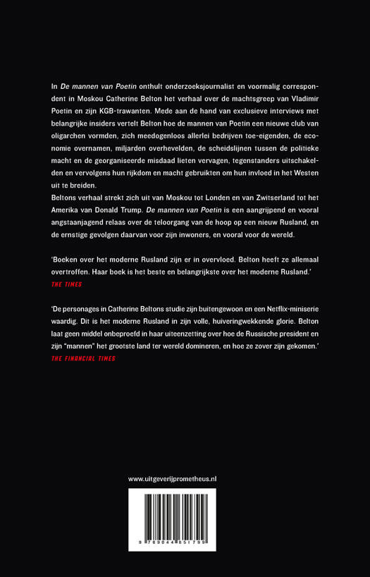 ‘Meedogenloos en overrompelend. Dit is het indrukwekkendste relaas over de opkomst van Poetin tot nu toe. Belton biedt de meest gedetailleerde en meeslepende versie van dit verhaal, gebaseerd op tientallen interviews met oligarchen en Kremlininsiders, evenals voormalige KGB-agenten en Zwitserse en Russische bankiers. Duizelingwekkend... Een prachtig boek.’ The Guardian