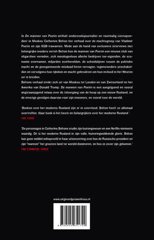 ‘Beltons boek is vlot geschreven, bevat grondig onderzoek en staat vol met nieuwe – of in ieder geval niet algemeen bekende – feiten. Dit is een fantastisch journalistiek boek, geschreven met oog voor een goedlopend verhaal en meeslepende personages.’ The Spectator ‘In haar schokkende nieuwe boek onthult Catherine Belton hoe een handvol KGB’ers sinds eind jaren tachtig door middel van het witwassen van vele miljarden het Westen ontwricht en zichzelf verrijkt.’ Michel Krielaars, NRC Handelsblad●●●●●