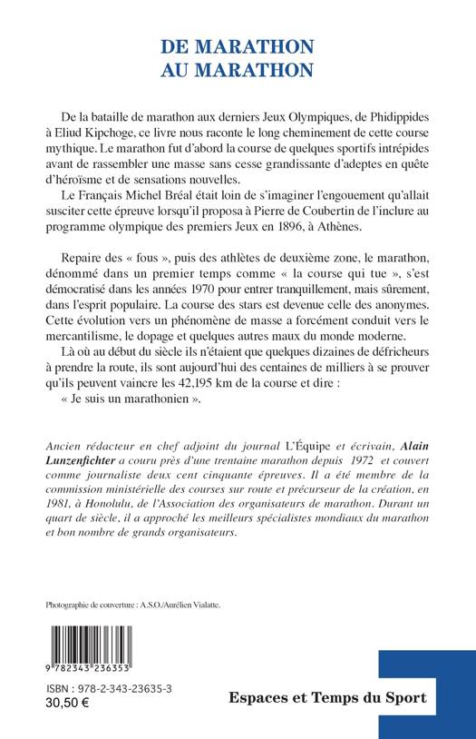 De la bataille de marathon aux derniers Jeux Olympiques, de Phidippides à Eliud Kipchoge, ce livre nous raconte le long cheminement de cette course mythique. Le Français Michel Bréal était loin de s’imaginer l’engouement qu’allait susciter cette épreuve lorsqu’il proposa à Pierre de Coubertin de l’inclure au programme olympique des premiers Jeux en 1896, à Athènes. Repaire des « fous », puis des athlètes de deuxième zone, le marathon, dénommé dans un premier temps comme « la course qui tue », s’est démocratisé dans les années 1970 pour entrer tranquillement, mais sûrement, dans l’esprit populaire. Cette évolution vers un phénomène de masse a forcément conduit vers le mercantilisme, le dopage et quelques autres maux du monde moderne. Là où au début du siècle ils n’étaient que quelques dizaines de défricheurs à prendre la route, ils sont aujourd’hui des centaines de milliers à se prouver qu’ils peuvent vaincre les 42,195 km de la course et dire : « Je suis un marathonien ».