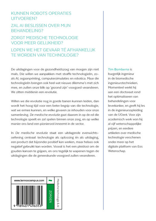 KUNNEN ROBOTS OPERATIES UITVOEREN? ZAL AI BESLISSEN OVER MIJN BEHANDELING? ZORGT MEDISCHE TECHNOLOGIE VOOR MEER GELIJKHEID? LOPEN WE HET GEVAAR TÉ AFHANKELIJK TE WORDEN VAN TECHNOLOGIE? De uitdagingen voor de gezondheidszorg van morgen zijn niet mals. Die willen we aanpakken met straffe technologieën, zoals AI, orgaanprinting, computersimulaties en robotica. Maar die technologieën brengen ook heel wat nieuwe dilemma's met zich mee, en zullen onze blik op 'gezond zijn' voorgoed veranderen. We zitten middenin een revolutie. Willen we die revolutie nog in goede banen kunnen leiden, dan wordt het hoog tijd voor een beter begrip van die technologie, wat we ermee kunnen, en welke gevaren ze inhouden voor onze samenleving. De medische revolutie gaat daarom in op de rol die technologie speelt en zal spelen binnen onze zorg, en op welke manier ons land een pioniersrol inneemt in de sector. In De medische revolutie staat een uitdagende evenwichtsoefening centraal: technologie als oplossing én als uitdaging, een product dat bijzonder positief kan werken, maar helaas ook negatief gebruikt kan worden. Vooral is het een pleidooi om de gouden kansen te grijpen, en ons tegelijk te wapenen tegen de uitdagingen die de geneeskunde voorgoed zullen veranderen.