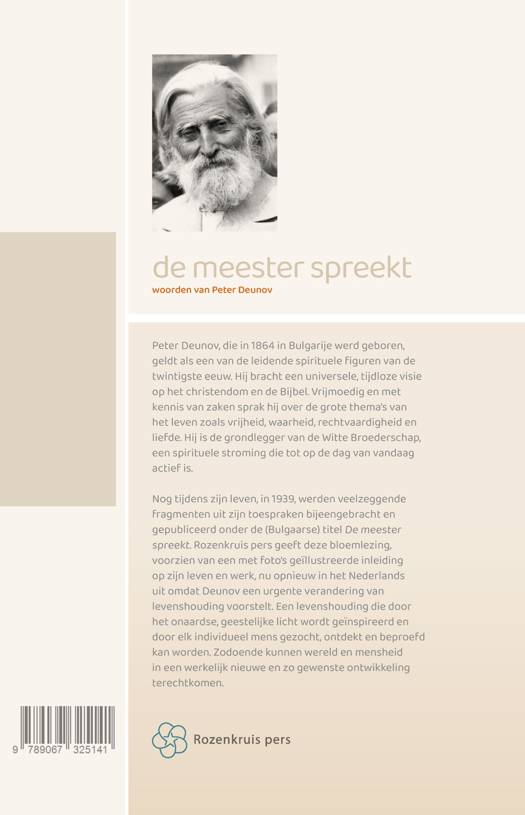 Peter Deunov, die in 1864 in Bulgarije werd geboren, geldt als een van de leidende spirituele figuren van de twintigste eeuw. Hij bracht een universele, tijdloze visie op het christendom en de Bijbel. Vrijmoedig en met kennis van zaken sprak hij over de grote thema’s van het leven zoals vrijheid, waarheid, rechtvaardigheid en liefde. Hij is de grondlegger van de Witte Broederschap, een spirituele stroming die tot op de dag van vandaag actief is. Nog tijdens zijn leven, in 1939, werden veelzeggende fragmenten uit zijn toespraken bijeengebracht en gepubliceerd onder de (Bulgaarse) titel De meester spreekt. Rozenkruis pers geeft deze bloemlezing, voorzien van een met foto’s geïllustreerde inleiding op zijn leven en werk, nu opnieuw in het Nederlands uit omdat Deunov een urgente verandering van levenshouding voorstelt. Een levenshouding die door het onaardse, geestelijke licht wordt geïnspireerd en door elk individueel mens gezocht, ontdekt en beproefd kan worden. Zodoende kunnen wereld en mensheid in een werkelijk nieuwe en zo gewenste ontwikkeling terechtkomen.