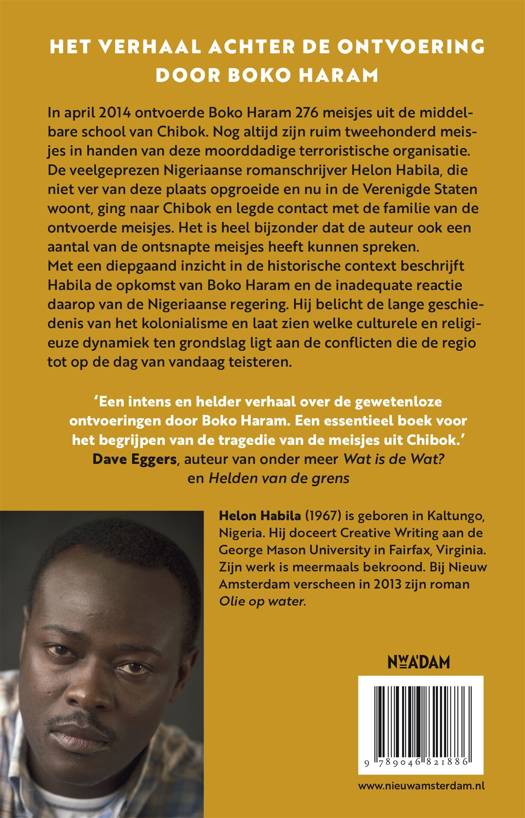 Boko Haram ontvoerde ruim twee jaar geleden 267 meisjes van de middelbare school in Chibok. De veelgeprezen Nigeriaanse romanschrijver Helon Habila, afkomstig uit de streek, keerde terug naar Chibok, legde contact met de familie en sprak ontvoerde meisjes. Vervuld van mededogen en met een diepgaand inzicht in de historische context beschrijft Habila de opkomst van Boko Haram en de inadequate reactie daarop van de Nigeriaanse regering. Habila belicht de lange geschiedenis van het kolonialisme en geeft inzicht in de culturele en religieuze dynamiek die ten grondslag ligt aan de conflicten waar de regio tot op de dag van vandaag door wordt geteisterd.
