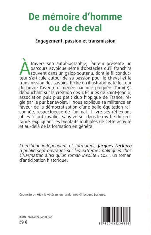 A travers son autobiographie, l’auteur présente un parcours atypique semé d’obstacles qu’il franchira souvent dans un galop soutenu, dont le fil conducteur s’articule autour de sa passion pour le cheval et la transmission des savoirs. Riche en illustrations, le lecteur découvre l’aventure menée par une poignée d’ami(e)s débouchant sur la création des « Écuries de Saint-Jean », association puis plus petit club hippique de France, régie par le pur bénévolat. Il nous explique sa militance en faveur de la démocratisation d’une belle équitation raisonnée, respectueuse de l’animal. Il livre ses réflexions utiles à tout cavalier, sans verser dans le mythe du centaure, expliquant les bienfaits multiples de cette activité et au-delà de la formation en général.