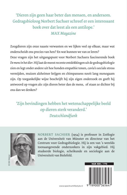 Cavia's vermijden sociale stress. Dolfijnen en olifanten kunnen zich verplaatsen in anderen. En honden kunnen oprecht jaloers zijn. Uit onderzoek van de afgelopen jaren zijn we steeds meer te weten gekomen over dieren. Zoogdieren zijn onze naaste verwanten en we lijken veel op elkaar, maar wat onderscheidt ons precies van hen? En wat kunnen we van ze leren? Deze vragen zijn het uitgangspunt voor Norbert Sachsers fascinerende boek De mens in het dier. Hij laat de meest recente ontdekkingen uit de gedragsbiologie zien en beschrijft onder andere hoe honden empathie tonen, muizen alzheimer krijgen en waarom chimpansees oorlog voeren. Op toegankelijke wijze beschrijft hij de essentie van zijn eigen baanbrekende onderzoek en geeft antwoord op vragen als: zijn dieren beter dan de mens – of staan ze dichter bij ons dan we denken?