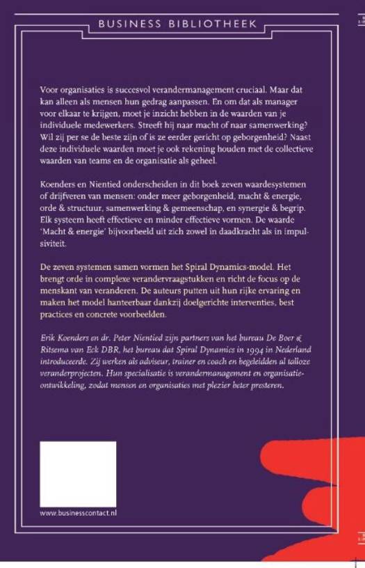 De zeven systemen samen vormen het Spiral Dynamics-model. Het brengt orde in complexe verandervraagstukken en richt de focus op de menskant van veranderen. Puttend uit hun rijke ervaring en maken de auteurs het model hanteerbaar dankzij doelgerichte interventies, best practices en concrete voorbeelden.