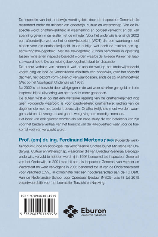 De auteur verhaalt van binnenuit wat er aan de wet op het onderwijstoezicht vooraf ging en hoe de verschillende ministers van onderwijs, over het toezicht dachten, het toezicht vorm gaven of verwaarloosden. sinds de zg. Mammoetwet. (Wet op het Voortgezet Onderwijs uit 1963).