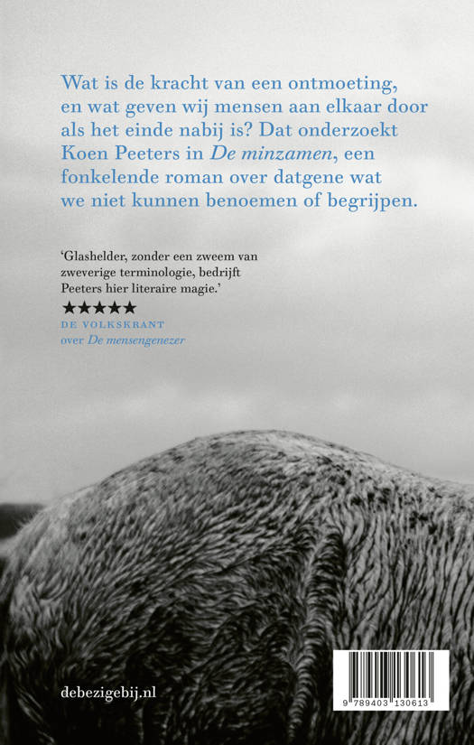 In De minzamen werpt Koen Peeters vragen op over het mysterieuze, het menselijke en de alom aanwezige geschiedenis. Bovendien slaat Peeters op wonderlijke wijze een brug naar De mensengenezer, de betoverende roman waarmee hij de ECI Literatuurprijs won.