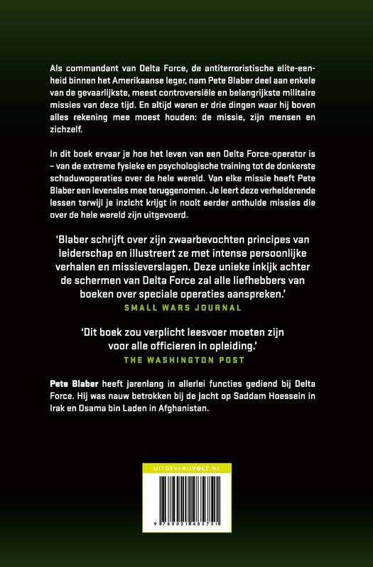Als commandant van Delta Force, de antiterroristische elite-eenheid binnen het Amerikaanse leger, nam Pete Blaber deel aan enkele van de gevaarlijkste, meest controversiële en belangrijkste militaire missies van deze tijd. En altijd waren er drie dingen waar hij boven alles rekening mee moest houden: de missie, zijn mensen en zichzelf.