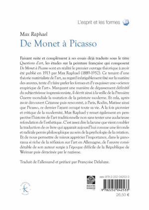 Faisant suite et complement a ses essais deja traduits sous le titre Questions d'art, les etudes sur la peinture francaise qui composent De Monet a Picasso sont en realite le premier ouvrage theorique a avoir ete publie en 1913 par Max Raphael (1889-1952). Ce tenant d'une theorie materialiste de l'art, au regard infatigablement fixe sur la matiere des oeuvres, tente d'y faire parler les formes et d'y esquisser une science empirique de l'art . Marquant une maniere de depassement definitif du subjectivisme impressionniste, il decrit ainsi a la veille de la Premiere Guerre mondiale la mutation de la peinture moderne. Et cela, apres avoir decouvert Cezanne puis rencontre, a Paris, Rodin, Matisse ainsi que Picasso, ce dernier l'ayant occupe toute sa vie. A la fois pionnier et critique de la modernite, Max Raphael y remet egalement en perspective l'histoire de l'art traditionnelle non sans tenter une audacieuse refondation de l'esthetique. C'est assez dire la lacune que vient combler la traduction de ce livre qui apparait aujourd'hui comme une feconde et radicale percee philosophique au sein de la psychologie de la creation. Et de nous permettre de mieux apprecier l'importance, dans le panorama si riche de la reflexion sur l'art en Allemagne, de l'oeuvre considerable de son auteur surgie a l'epoque difficile de la Republique de Weimar puis deracinee par le nazisme.
