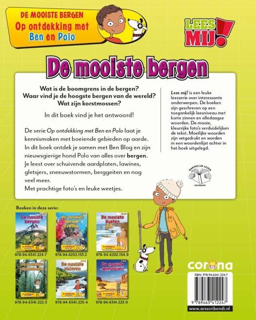 Wat is de boomgrens in de bergen? Waar vind je de hoogste bergen van de wereld? Wat zijn korstmossen? In dit boek ontdek je samen met Ben Blog en zijn nieuwsgierige hond Polo van alles over bergen. Je leest over schuivende aardplaten, lawines, gletsjers, sneeuwstormen, berggeiten en nog veel meer.