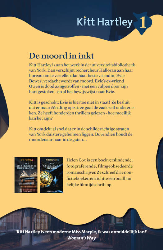 Deel 1 in de Kitt Hartley-serie. Kitt Hartley is aan het werk in de universiteitsbibliotheek van York. Het lijkt een dag als alle andere, maar dan verschijnt rechercheur Halloran aan haar bureau om te vertellen dat haar beste vriendin, Evie Bowes, verdacht wordt van moord. Evies ex-vriend Owen is dood aangetroffen - met een vulpen door zijn hart gestoken - en al het bewijs wijst naar haar. Kitt is geschokt en acht het uitgesloten dat Evie hiertoe in staat zou zijn. Ze besluit dat er maar één ding op zit: ze gaat zelf onderzoek doen naar de moord op Owen. Ze heeft honderden thrillers gelezen - hoe moeilijk kan het zijn? Met hulp van haar assistent Grace gaat ze aan de slag. Ze ontdekt al snel dat er in de schilderachtige straten van York duistere geheimen liggen. Bovendien houdt de moordenaar haar in de gaten…