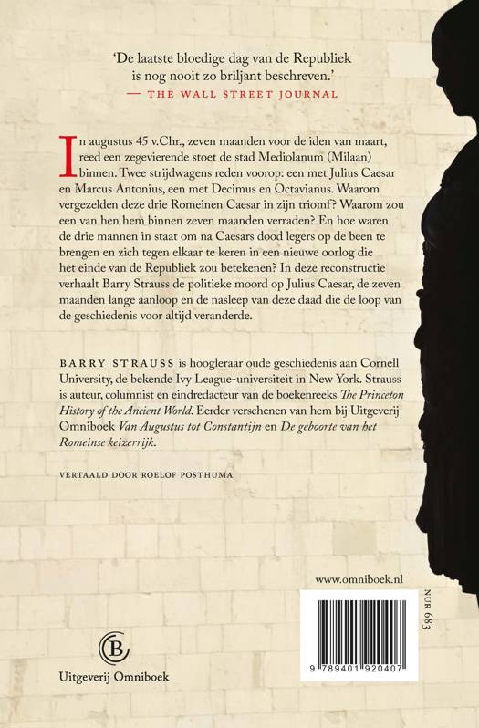 In augustus 45 v.Chr., zeven maanden voor de iden van maart, reed een zegevierende stoet de stad Mediolanum (Milaan) binnen. Twee strijdwagens reden voorop: een met Julius Caesar en Marcus Antonius, een met Decimus en Octavianus. Waarom vergezelden deze drie Romeinen Caesar in zijn triomf? Waarom zou een van hen hem binnen zeven maanden verraden? En hoe waren de drie mannen in staat om na Caesars dood legers op de been te brengen en zich tegen elkaar te keren in een nieuwe oorlog die het einde van de Republiek zou betekenen? In deze reconstructie verhaalt Barry Strauss de politieke moord op Julius Caesar, de zeven maanden lange aanloop en de nasleep van deze daad die de loop van de geschiedenis voor altijd veranderde.