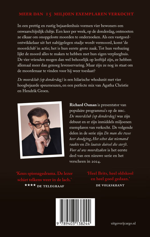 Wie denkt dat er weinig te beleven valt in een rusthuis, heeft nog geen kennisgemaakt met Elizabeth en haar vrienden. Voor hen geen breiwerkjes of bridgenamiddagen, want ze hebben een beter vertier: de moordclub (op donderdag). Wanneer er een dode valt, kunnen ze zich tot hun vreugde eens over een ‘hot case’ buigen en dat doen ze vol overgave. Richard Osmans krasse, oer-Britse bejaarden stuur je niet zomaar met een kluitje in het riet. En dat is maar goed ook, want je moet al een verdomd goede speurneus zijn om de plottwists te voorspellen. Opgepast, gevaar voor bingereaden!