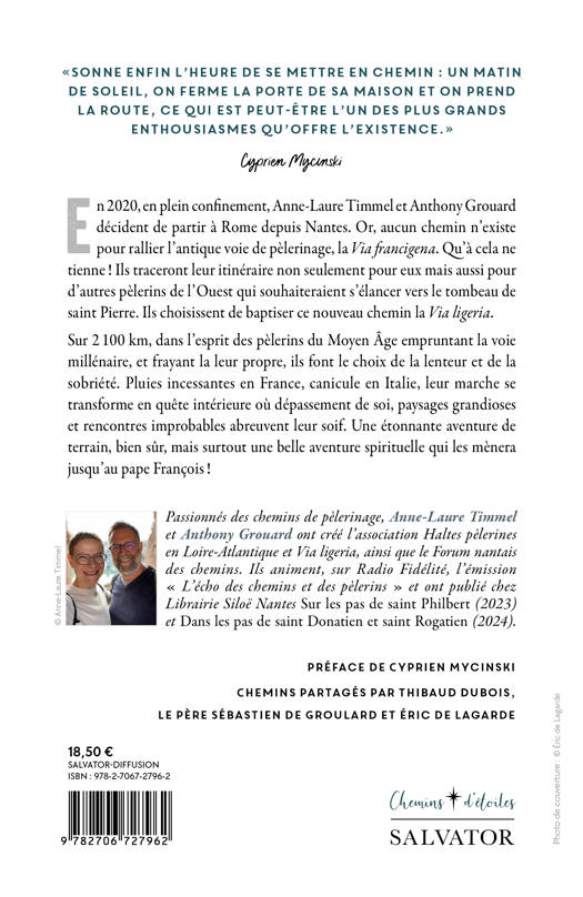 « Sonne enfin l'heure de se mettre en chemin : un matin de soleil, on ferme la porte de sa maison et on prend la route, ce qui est peut-être l'un des plus grands enthousiasmes qu'offre l'existence. » Cyprien Mycinski En 2020, en plein confinement, Anne-Laure Timmel et Anthony Grouard décident de partir à Rome depuis Nantes. Or, aucun chemin n'existe pour rallier l'antique voie de pèlerinage, la Via francigena. Qu'à cela ne tienne ! Ils traceront leur itinéraire non seulement pour eux mais aussi pour d'autres pèlerins de l'Ouest qui souhaiteraient s'élancer vers le tombeau de saint Pierre. Ils choisissent de baptiser ce nouveau chemin la Via ligeria. Sur 2 100 km, dans l'esprit des pèlerins du Moyen Âge empruntant la voie millénaire, et frayant la leur propre, ils font le choix de la lenteur et de la sobriété. Pluies incessantes en France, canicule en Italie, leur marche se transforme en quête intérieure où dépassement de soi abreuvant leur soif.