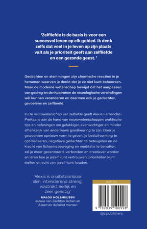 In De neurowetenschap van zelfliefde geeft Alexis Fernandez-Preiksa je aan de hand van neurowetenschappen praktische tips en oefeningen om gelukkiger, evenwichtiger en minder afhankelijk van andermans goedkeuring te zijn. Door je gewoonten opnieuw vorm te geven, je besluitvorming te optimaliseren, negatieve gedachten te beteugelen en de kracht van lichaamsbeweging en meditatie te benutten, zal je meer gecentreerd, verbonden en creatiever worden en leren hoe je jezelf kunt vertrouwen, prioriteiten kunt stellen en echt van jezelf kunt houden.