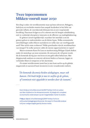 Eén ding is zeker: de wereldeconomie staat op losse schroeven. Beleggers, bedrijven en overheden moeten hun aanpak herdenken in het licht van gierende inflatie, de voortdurende klimaatcrisis en een vergrijzende bevolking. Daarnaast krijgen ze af te rekenen met de hoogste schuldenberg ooit in vredestijd, disruptieve innovatie en de effecten van multiglobalisering. Er gebeurt zoveel tegelijkertijd, waardoor het moeilijk is om de grotere golven te onderscheiden van de kleine hypes. Welke economische ontwikkelingen zullen blijven nazinderen en welke zijn van voorbijgaande aard? Hoe zal de rente evolueren? Welke groeilanden zijn de wereldmachten van morgen? In welke sectoren vallen de meeste opportuniteiten te rapen? Macro-econoom Koen De Leus en marktstrateeg Philippe Gijsels duiken onder de motorkap van onze economie. Ze ontwaren de vijf grote trends die de komende dertig jaar ons leven en ons geld zullen beheersen. Met diepgravende analyses en concrete adviezen bieden ze houvast, leggen ze verbanden bloot en temperen ze het alarmisme. De nieuwe wereldeconomie toont hoe je mee kunt surfen op de globale megatrends en succesvol kunt investeren in een veranderende realiteit. 'De komende decennia bieden uitdagingen, maar ook kansen. Dit boek helpt je mee te surfen op de golven, of tenminste niet opgeslokt te worden door de tsunami.'
