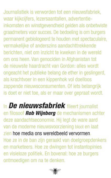 Journalistiek is verworden tot een ordinaire nieuwsfabriek, waar kijkcijfers, lezersaantallen, advertentie-inkomsten en winstgevendheid gelden als onbetwiste graadmeters voor succes. De bedoeling is om burgers permanent gebiologeerd te houden met spectaculaire, vermakelijke of anderszins aandachttrekkende berichten, niet om inzicht te kweken in de wereld om ons heen. Van genociden in Afghanistan tot de nieuwste haardracht van Gordon: alles wordt zonder enige maatstaf van publiek belang de ether ingeslingerd, als krachtvoer in een kippenhok vol doelloos zappende nieuwsconsumenten. Of iets belangrijk is doet er niet toe, als er maar over gepraat wordt. In De nieuwsfabriek fileert Rob Wijnberg de mechanismen achter deze aandachtseconomie. Op karakteristieke wijze legt hij de ware aard van de moderne nieuwsvoorziening bloot. Hoe ze in de ban is geraakt van doelgroepdenkers en marketeers. Hoe ze dwingt tot instant-opinies en visieloze politiek. En bovenal: hoe ze burgers ontmoedigt om na te denken. Wie De nieuwsfabriek heeft gelezen, zal nooit meer achteloos het journaal bekijken of een krant openslaan.