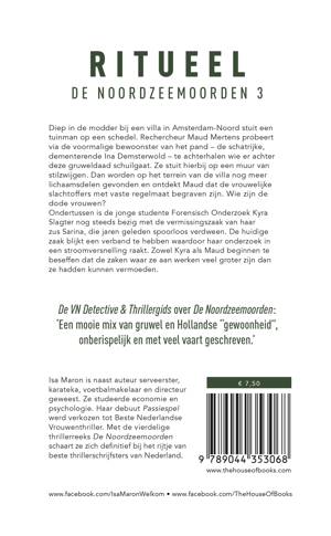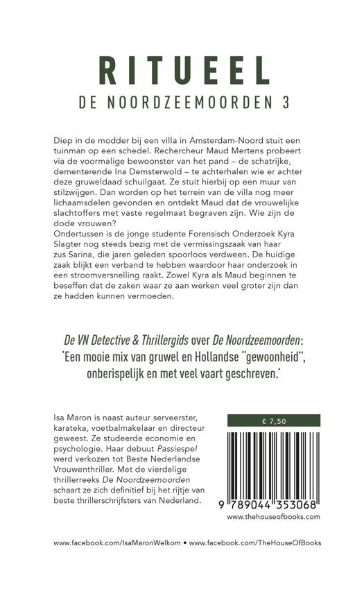 In 2014 veroverde Isa Maron de boekhandels en lezers met deel 1 en 2 van de succesvolle serie De Noordzeemoorden; een knap geconstrueerde, vierdelige thrillerserie die de lezer meevoert van Amsterdam naar Texel, en verder op een tocht langs de kille Noordzee. Op overtuigende wijze schiep Maron een beklemmende wereld waarin de levens van rechercheur Maud Mertens en student Forensisch Onderzoek Kyra Slager samenkwamen. Vele lezers raakten in de ban van de verdwijning van Sarina, de zus van Kyra. In Ritueel, deel 3 van de serie, raakt het onderzoek naar de vermissing van Sarina in een stroomversnelling en zowel Kyra als Maud beseffen dat de zaken waar ze aan werken veel groter zijn dan ze ooit hadden kunnen vermoeden.