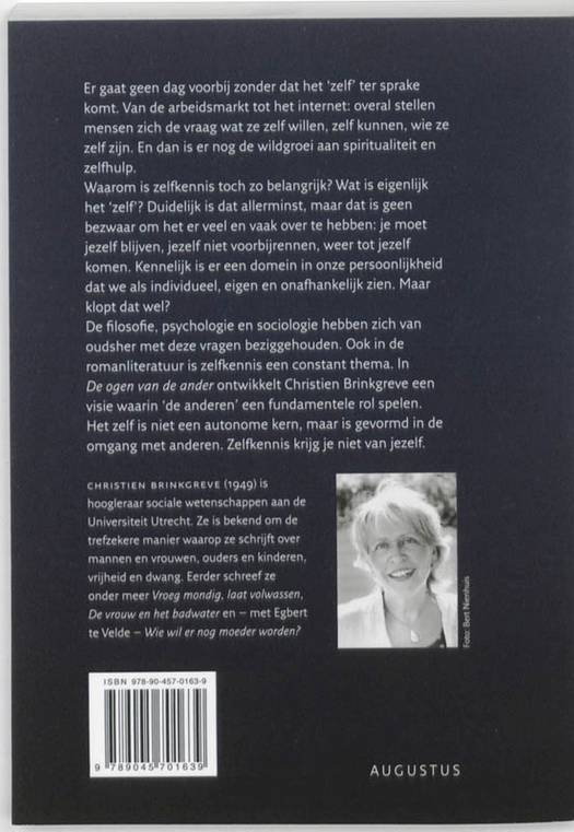 De filosofie, psychologie en sociologie hebben zich van oudsher met deze vragen beziggehouden. Ook in de romanliteratuur is zelfkennis een constant thema. In De ogen van de ander ontwikkelt Christien Brinkgreve een visie waarin de anderen een fundamentele rol spelen. Het zelf is niet een autonome kern, maar is gevormd in de omgang met anderen. Zelfkennis krijg je niet van jezelf.