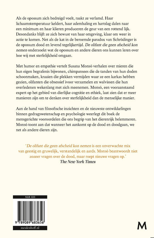 Als de opossum (of buidelrat) zich bedreigd voelt, raakt ze verlamd. Haar lichaamstemperatuur keldert, haar ademhaling en hartslag dalen naar een minimum en haar klieren produceren de geur van een rottend lijk. Desondanks blijft ze zich bewust van haar omgeving, klaar om weer in actie te komen. Net als de kat in de beroemde paradox van Schrödinger, is de opossum dood en levend tegelijkertijd. De olifant die geen afscheid kon nemen onderzoekt wat de opossum en andere dieren ons kunnen leren over hoe wij met sterfelijkheid omgaan.