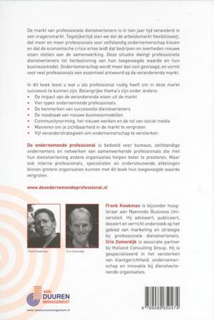De markt van professionele dienstverleners is in tien jaar tijd veranderd in een vragersmarkt. Tegelijkertijd zien we dat de arbeidsmarkt flexibiliseert, dat meer en meer professionals voor zelfstandig ondernemerschap kiezen en dat de economische crisis ertoe leidt dat bedrijven en overheden nieuwe eisen stellen aan de samenwerking. Deze situatie dwingt professionele dienstverleners tot herbezinning van hun toegevoegde waarde en hun businessmodel. Ondernemerschap wordt meer dan ooit gevraagd, en vormt voor veel professionals een essentieel antwoord op de veranderende markt. In dit boek leest u wat u als professional nodig heeft om in deze markt succesvol te kunnen zijn. Belangrijke thema?s zijn onder andere: ? De impact van de veranderende eisen uit de markt ? Vier typen ondernemende professionals ? De kenmerken van succesvolle dienstverleners ? De noodzaak van nieuwe businessmodellen ? Communityvorming, het nieuwe werken en de rol van social media ? Manieren om je zichtbaarheid in de markt te vergroten ? Vijf veranderstrategie?n om ondernemerschap te versterken De ondernemende professional is bedoeld voor bureaus, zelfstandige ondernemers en netwerken van samenwerkende professionals die met hun dienstverlening andere organisaties helpen beter te presteren. Maar ook interne professionals, specialisten en ondersteunende afdelingen binnen grotere organisaties kunnen met dit boek hun toegevoegde waarde vergroten.