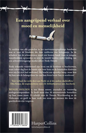 De onderwijzer van Auschwitz van Wendy Holden is een eerbetoon aan een man die zelfs in de donkerste tijden vreugde wist te brengen. Te midden van alle gruwelen in het nazivernietigingskamp Auschwitz was er voor de kinderen die daar verbleven één lichtpuntje. In de schaduw van de schoorstenen stond een houten barak waar ze zongen, toneelstukken opvoerden en over de wereld leerden onder leiding van een achtentwintigjarige Joodse atleet: Fredy Hirsch. Fredy riskeerde voortdurend zijn leven om de kinderen te beschermen, want iedere dag kon de laatste zijn voor hem en de honderden kinderen over wie hij zich had ontfermd. Hij bracht een sprankje hoop, maar kon hij hun ook de belangrijkste les van hun leven leren: hoe te overleven? 'Angstaanjagend en toch prachtig. Het verhaal geeft op krachtige wijze weer wat een intelligente, liefdevolle en energieke man Fredy was.' Dr. Elizabeth Baer, United States Holocaust Memorial Museum