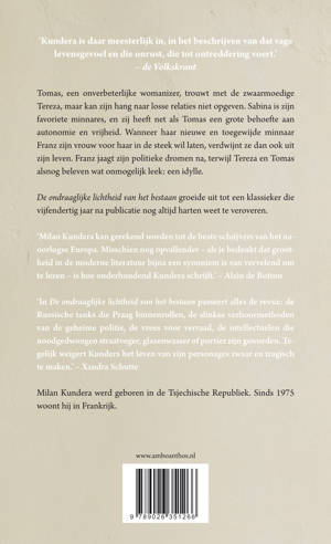 De bestseller gaat over de essentie van de liefde en seksualiteit tegen de achtergrond van de roerige naoorlogse Tsjechische geschiedenis. Het klassiek geworden meesterwerk weet na dertig jaar nog altijd harten te veroveren en Milan Kundera geldt als een van de belangrijkste hedendaagse Europese schrijvers. Hij ontving talloze onderscheidingen en prijkt al jaren op het lijstje van mogelijke Nobelprijskandidaten.