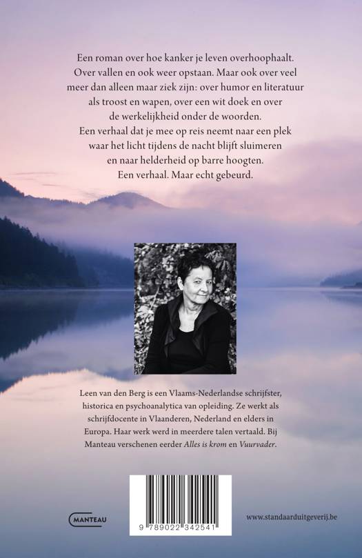 Een roman over hoe kanker je leven overhoophaalt.Over vallen en ook weer opstaan. Maar ook over veel meer dan alleen maar ziek zijn: over humor en literatuur als troost en wapen, over een wit doek en over de werkelijkheid onder de woorden.Een verhaal dat je mee op reis neemt naar een plek waar het licht tijdens de nacht blijft sluimeren en naar helderheid op barre hoogten.Een verhaal. Maar echt gebeurd.