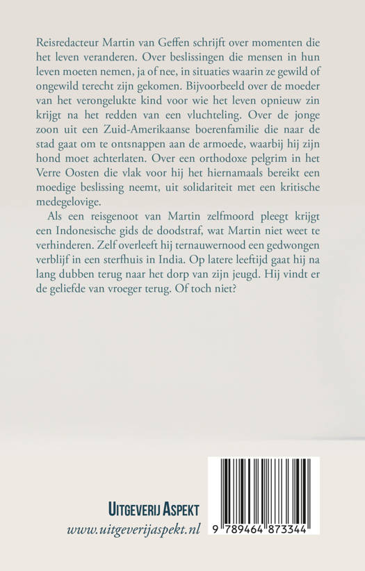 Reisredacteur Martin van Geffen schrijft over momenten die het leven veranderen. Over beslissingen die mensen in hun leven moeten nemen, ja of nee, in situaties waarin ze gewild of ongewild terecht zijn gekomen. Bijvoorbeeld over de moeder van het verongelukte kind voor wie het leven opnieuw zin krijgt na het redden van een vluchteling. Over de jonge zoon uit een Zuid-Amerikaanse boerenfamilie die naar de stad gaat om te ontsnappen aan de armoede, waarbij hij zijn hond moet achterlaten. Over een orthodoxe pelgrim in het Verre Oosten die vlak voor hij het hiernamaals bereikt een moedige beslissing neemt, uit solidariteit met een kritische medegelovige.