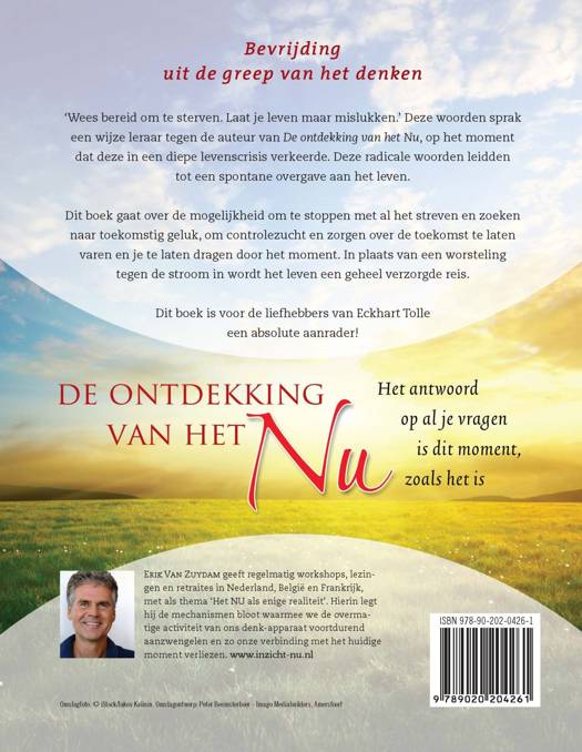 'Wees bereid om te sterven. Laat je leven maar mislukken.' Deze woorden sprak een wijze leraar tegen Erik Zuydam, de auteur van 'De ontdekking van het Nu', op het moment dat deze in een diepe levenscrisis verkeerde. Deze radicale woorden leidden tot een spontane overgave aan het leven: 'Wat een verrukking, om niet langer alles te moeten weten wat er dient te gebeuren, om niet meer te hoeven weten waar ik naar toe zou moeten, om me te laten verrassen, om me mee te laten drijven op de stroom van het geheel en te weten dat het leven op deze manier zoveel rijker, zoveel voller en zoveel kleurrijker is'.