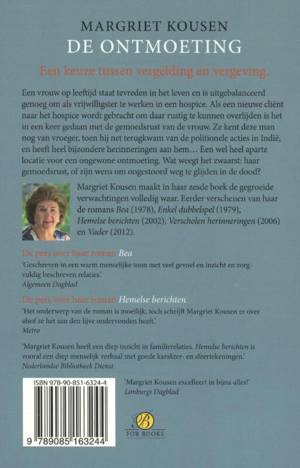 De ontmoeting - Margriet Kousen Een vrouw op leeftijd staat tevreden in het leven en is uitgebalanceerd genoeg om als vrijwilliger te werken in een hospice. Als een nieuwe cliënt naar het hospice wordt gebracht om daar rustig te kunnen overlijden is het in een keer gedaan met de gemoedsrust van de vrouw. Ze kent deze man nog van vroeger, toen hij net terugkwam van de politionele acties in Indië, en heeft heel bijzondere herinneringen aan hem... Een wel heel aparte locatie voor een ongewone ontmoeting. Wat weegt het zwaarst: haar gemoedsrust, of zijn wens om ongestoord weg te glijden in de dood? Margriet Kousen maakt in haar zesde boek de gegroeide verwachtingen volledig waar.