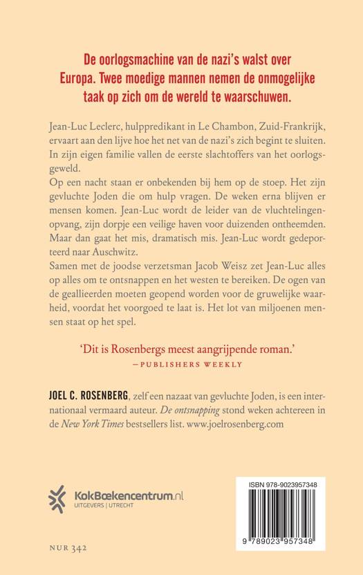 De ontsnapping van Joel Rosenberg is een historische roman over twee mannen die ontsnappen uit Auschwitz om de wereld te waarschuwen. De Franse predikant Jean-Luc Leclerc wordt ongewild de leider van de opvang voor gevluchte Joden. Zijn dorpje wordt een veilige haven voor duizenden ontheemden. Maar dan gaat het dramatisch mis. Jean-Luc wordt gedeporteerd naar Auschwitz. Samen met Jacob Weisz, een joodse verzetsman, besluit hij te ontsnappen om het westen te bereiken. Koste wat kost moeten de ogen van de geallieerden geopend worden voor de gruwelijke waarheid van wat zich in Polen afspeelt. Het lot van miljoenen mensen staat op het spel.