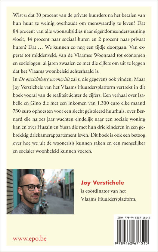 Wist u dat 30 procent van de private huurders na het betalen van hun huur te weinig overhoudt om menswaardig te leven? Dat 84 procent van alle woonsubsidies naar eigendomsondersteuning vloeit, 14 procent naar sociaal huren en 2 procent naar privaat huren? Dat … We kunnen zo nog een tijdje doorgaan. Van experts tot middenveld, van de Vlaamse Woonraad tot economen en sociologen: al jaren zwaaien ze met die cijfers om uit te leggen dat het Vlaams woonbeleid achterhaald is. In De onzichtbare wooncrisis zal u die gegevens ook vinden. Maar Joy Verstichele van het Vlaams Huurdersplatform vertrekt in zijn boek vooral van de realiteit áchter de cijfers. Een verhaal over Isabelle en Gino die met een inkomen van 1.300 euro elke maand 730 euro ophoesten voor een slecht geïsoleerd huurhuis, over Bernard die na zes jaar wachten eindelijk naar een sociale woning kan en over Husain en Yusra die met hun drie kinderen in een driekamerappartement leven. Dit boek is ook een betoog over hoe we uit de wooncrisis kunnen raken en een menselijker en socialer woonbeleid kunnen voeren.
